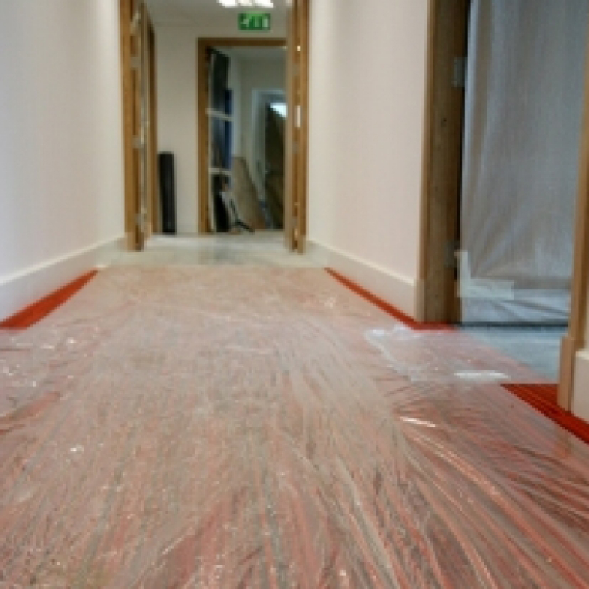 Florprotec TacBac standard clear carpet protection film should be used to protect entire carpeted areas and carpeted staircases. The usefully self-adhesive film can be laid freehand in single strips or across a whole carpet area to build a waterproof barrier which not only protects from dirt and spills but also foot traffic.