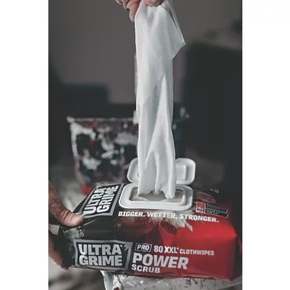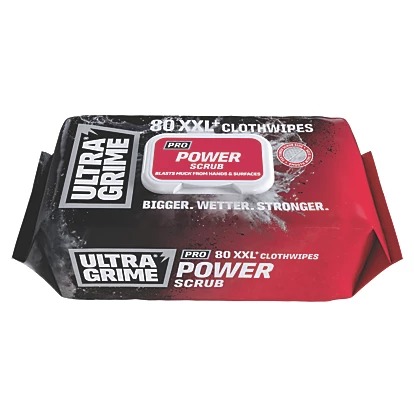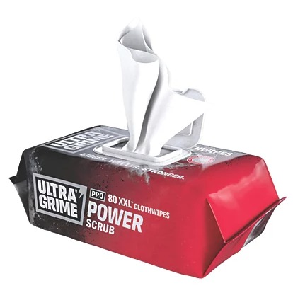 Ultragrime Power Scrub XXL ultra-strong cloth wipes are ideal for removing oil, grease, ink, paint, silicones and uncured PU foam. Features a powerful cleaning agent, and abrasive side for effective scrubbing of stubborn dirt and grime. Wipes remain wet and usable for over an hour and don’t dry out when the lid is left open. One wipe dispenses at a time.